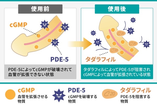 「cGMP(サイクリックGMP)」が分解されず十分に働くようになり、男性器へ多量の血液が流れ込むようになり力強い勃起が可能となります。