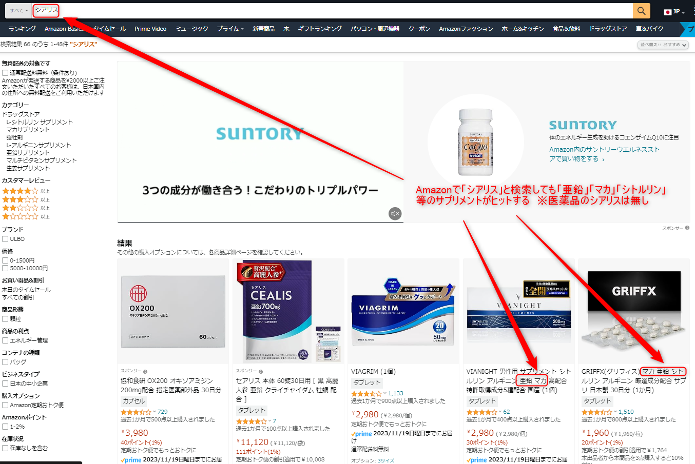実際にAmazonで「シアリス」と検索すると「亜鉛」「マカ」「シトルリン」等のサプリメントが検索結果として表示されます。