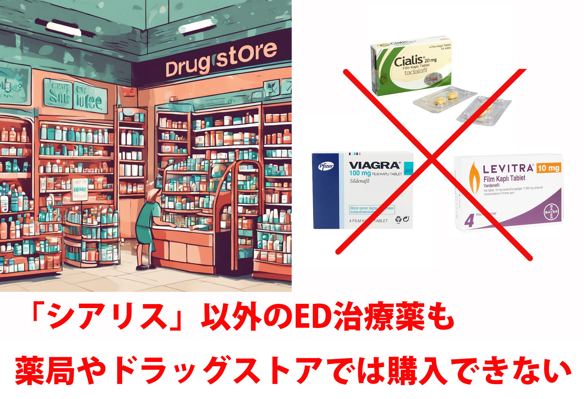 そのため、シアリス以外のED治療薬(バイアグラやレビトラ等)も医療用医薬品に該当するため、ドラッグストアや薬局で購入することができません。